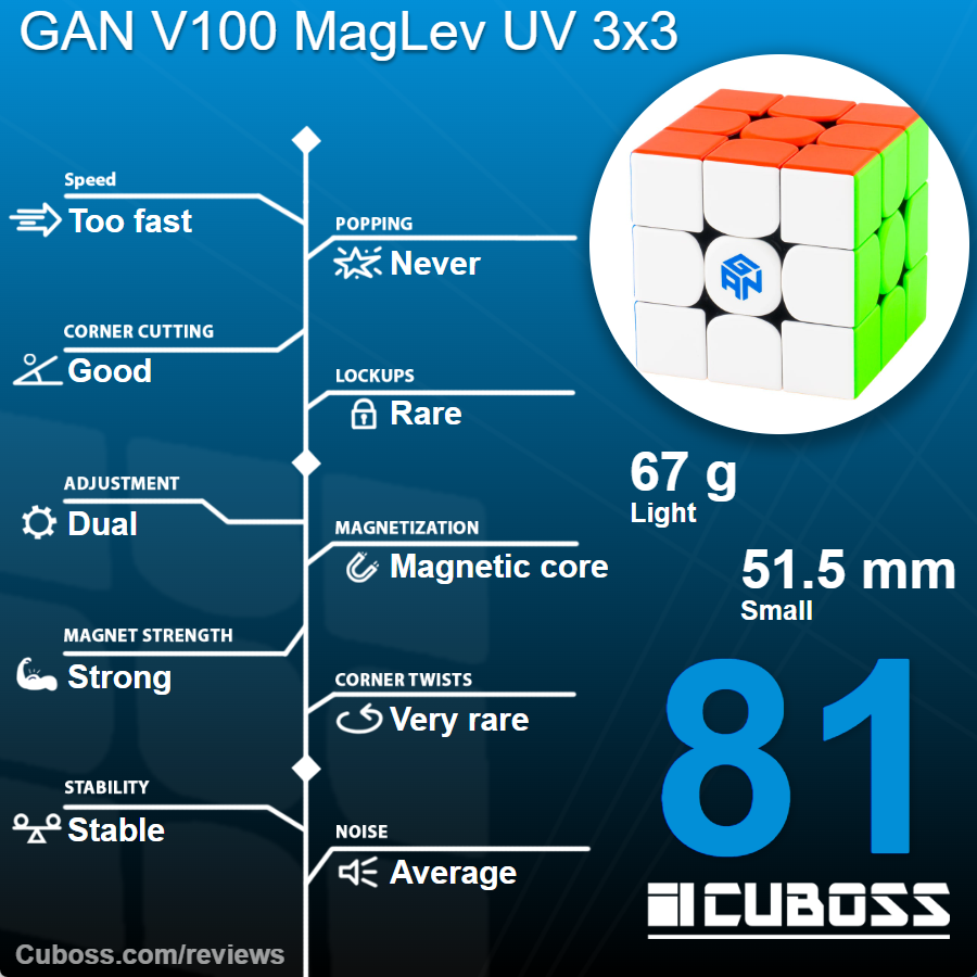 We of course use Cuboss’s own innovative and informative review system, popularized on our YouTube channel. Specs like the puzzle’s speed, performance, magnets, adjustment system and accessories are weighted and added up to a final rating – the model’s “Cuboss Score”, displayed in the bottom right corner of each review.