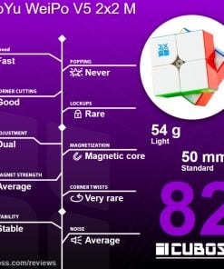 With the MoYu WeiPo V5 2×2, the manufacturer is competing for the place as the best 2×2 cube ever. At the time of writing, the MoYu WeiPo V5 2×2 M only comes in a luxury variant, where MoYu has not spared any expense. The puzzle has a magnetic core (20 magnet ball core) for a stronger and more even magnetic force, as well as UV coating for a shiny and scratch-resistant finish. Get your MoYu WeiPo V5 2×2 M today!